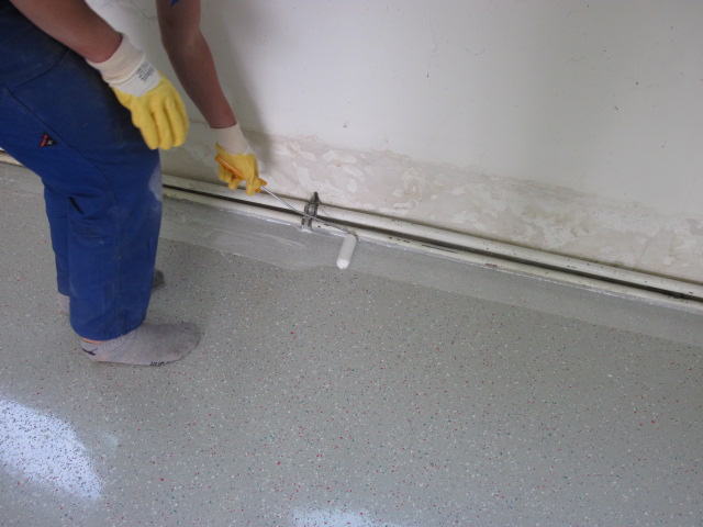 Auf diesen Bildern sehen Sie die bereits aufgetragene, noch frische Grundierung, wie sie gerade leicht abgesandet wird. Die Grundierung wurde in diesem Fall leicht eingefärbt. Man kann dies tun, um z.B. abzusichern, dass keine Fehlstellen entstehen. Dies ist auch in der Folgeschicht hilfreich, wenn man sehen kann, wo bereits Material aufgetragen wurde. Vor allem ist es beim Auftrag sehr dünner Systeme (Versiegelungen) hilfreich. Die Grundierung wurde mit dem Moosgummischieber vorgelegt und mit der Malerwalze nachverteilt und durch das Nachwalzen auch besser in den Untergrund gearbeitet.